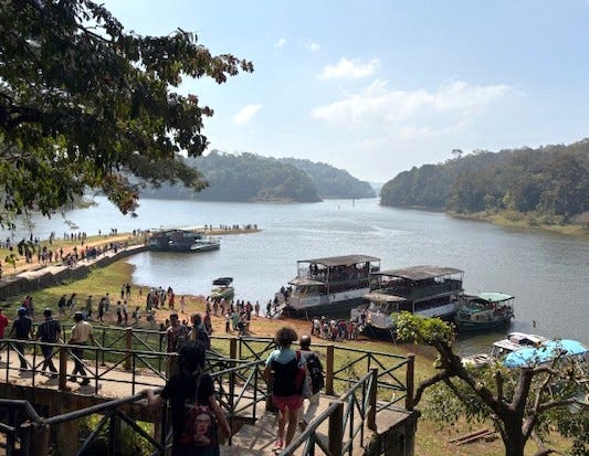 We spent two days in Madurai, then drove south and into the Cardamom Hills to see a tea museum and watch tea pickers, tour a spice plantation, and learn about elephants at a rescue station. At a national wildlife park on a lake, a place Tom and I had visited, I felt disoriented by how much it had changed.